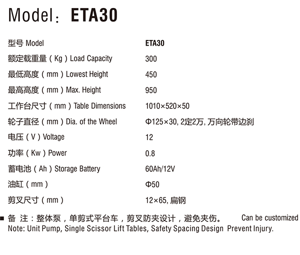 备注:整体泵,单剪式平台车,剪叉防夹设计,避免夹伤